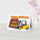 Un chariot élévateur tenant un colis. Ajoutez le nom du garçon d'anniversaire pour personnaliser cette carte.