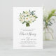 Les élégantes invitations aux fêtes florales comprennent un bouquet de roses blanches d'aquarelle et des pivoines au feuillage botanique vert luxuriant et des feuilles. Personnalisez avec les détails de votre fiançailles sous un mélange chic de polices de blocs, serif et calligraphie.