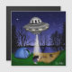 Art alien dessiné à la main. OVNI essayant d'enlever un homme campant au bord du lac dans la forêt.