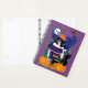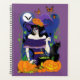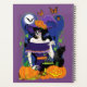 Une sorcière tout habillé sur le dessus en violet et des oranges avec le crâne de sucre jour du maquillage mort. Chat noir, citrouilles de chaudron et une pleine lune derrière eux.