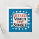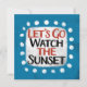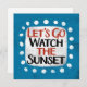 "Let's Go Watch The Sunset" est un design de texte mignon en bleu clair avec du texte en noir et rouge, avec une forme d'accent blanc et des points blancs texturés blancs qui l'entourent.