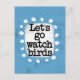 Un joli dessin typographique qui dit "Allons observer les oiseaux". C'est du texte noir sur un rectangle blanc avec des points amusants et amusants qui l'entourent, le tout sur un arrière - plan bleu clair.