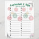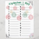 Comment jouer : Une façon facile de jouer est de commencer avec la lettre A. Écrire quelque chose de Noël en rapport que vous pouvez voir en commençant par cette lettre. Il peut s'agir d'un lieu, d'une personne ou d'un objet. Par exemple, A- Angel, B- Bow, C- Christmas Presents, et continuez à parcourir chaque lettre! Si vous avez plusieurs joueurs, vous pouvez à tour de rôle trouver un objet et avoir les autres joueurs deviner avant d'écrire ce que vous avez espionné. Une autre façon de jouer : 1. Écrivez des listes séparées des choses que vous voyez en commençant par les lettres de l'alphabet 2. Comparez les listes lorsque tous les joueurs ont écrit une réponse pour les 26 lettres. 3. Croisez les mêmes objets espionnés que les autres joueurs. Celui qui a le plus de réponses qui ne sont pas recoupées, gagne.