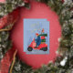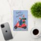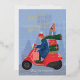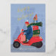 Cette carte de vœux festive amusante et non photographique présente une illustration dessinée à la main d'une femme conduisant un scooter rempli de cadeaux et comporte un espace pour inclure une photo de famille et un message au verso avec un vœu "Joyeuses Fêtes" en véritable papier métallisé.