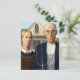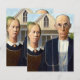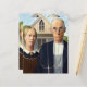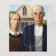 C'est le tableau classique de Grant Wood, American Gothic, montrant un fermier et sa femme debout devant leur ferme, lui avec sa fourche, son regard sur lui.