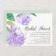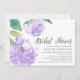 L'élégante invitation à la douche nuptiale présente des illustrations de fleurs de pivoine aquarelle dans le violet clair violet, accentuées de feuilles verts luxuriants. Personnalisez avec les détails de votre douche nuptiale alignés à droite. Cartes inversées à vert pastel massif.