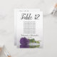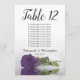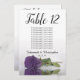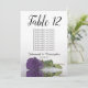 Ces belles cartes de numéro de table faciliteront la recherche de sièges à votre réception de mariage. Elles présentent un design simple mais élégant avec des lettres de calligraphie script et un seul rose améthyste de couleur violet à longue tige sur son côté réfléchissant dans l'eau. La carte comprend un tableau de sièges avec 10 noms. Il y a aussi de la place pour les noms du couple et la date du mariage. Cette carte est disponible dans une variété de tailles et est plus grande que nos cartes de numéro de table standard.