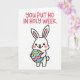 Cette carte montre une simple illustration numérique d'un personnage ressemblant à un lapin blanc aux longues oreilles 🐰 debout sur un fond blanc uni. Il a de petits yeux ronds noirs, des joues rondes et roses, et un sourire ouvert avec une petite langue qui dépasse, lui donnant un air doux et amical qui semble destiné à quelqu'un de proche. Le personnage tient un œuf ovale dans un câlin doux, comme s'il câlinait un petit cadeau pour un ami ou quelqu'un qu'il adore. L'œuf est décoré de bandes ondoyantes et fluides de bleu pastel, de rose doux et de jaune ensoleillé, ajoutant une touche printanière 🌷. Près du haut, un court message est écrit au-dessus du personnage dans des lettres arrondies de style bulle, colorées en rose vif. Le texte est centré et espacé de manière à donner l'impression qu'il s'adresse directement au lapin en dessous, ajoutant une chaleur légère et taquine à la scène. Les jou