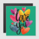 Une illustration à l'aquarelle joyeuse, expressive sur le plan émotionnel et magnifiquement réalisée, adaptée aux cartes de vœux, aux graphiques numériques et aux messages romantiques ou amicaux. L'image présente la phrase "Je t'aime" écrite en calligraphie à l'encre noire, gras et décontractée, superposée à un groupe de cœurs aux couleurs vives. Les cœurs sont réalisés dans une texture d'aquarelle vibrante utilisant des couleurs diverses et saturées comme le jaune, le magenta, le turquoise, le rose et l'orange.