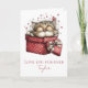Célébrez l'amour avec cette adorable carte de la Saint-Valentin pliée "Je t'aime pour toujours" qui présente un chaton confortablement installé dans une boîte à cadeaux, entouré de petits cœurs. Les tons chauds de bordeaux et de rouge créent une atmosphère romantique et ludique, parfaite pour les amoureux des chats qui apprécient les créations mignonnes et sincères. Le texte sur le devant peut être personnalisé avec un nom, ce qui fait de cette carte un véritable objet de valeur sentimental. À l'intérieur, le message est entièrement personnalisable, vous permettant d'ajouter vos propres mots pour un partenaire, un conjoint ou une personne spéciale. Le dos de la carte présente un détail subtil de chaton assorti, ce qui garde le design global propre et élégant. Idéal pour la Saint-Valentin, les anniversaires ou simplement pour rappeler à quelqu'un qu'il est aimé pour toujours.