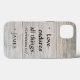 Love Endures All Things, avec nom ou monogramme prêt à être mis à jour. Une citation intemporelle de la bible sur l'endurance de l'amour est associée à un design en bois affaissé basé sur la photo d'une vraie table en bois. La table de l'image a duré des années de temps et d'utilisation, et a les fissures et la couleur grise s'est estompé en conséquence. Une métaphore appropriée pour la nature durable de l'amour. Citation des premiers Corinthiens. Le design en bois semble cool et s'enroule autour des côtés du coque dans cette disposition.