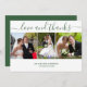 Carte photo mariage personnalisé pour dire "amour et merci" à vos invités. Le modèle photo est configuré pour vous permettre d'ajouter 3 photos (2x carré/paysage et 1x portrait) ainsi que vos noms, date de mariage et message personnalisé. Ce design simple et moderne est en vert chasseur et blanc avec un élégant script manuscrit et la typographie sans serif moderne.
