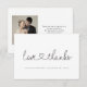 Voici notre Love and Thanks Heart Script Photo Mariage moderne, une façon magnifique et personnalisée d'express gratitude à vos invités mariages. Cette carte comporte une police de calligraphie de script élégante pour les mots "Amour et merci", accompagnée d'un doux détail de coeur, créant un design romantique et chaleureux. La carte incarne une esthétique moderne, chic et design, ce qui en fait un choix parfait pour exprimer votre appréciation. Personnalisez la carte avec vos noms, la date du mariage et un accueil spécial customisé du coeur. Cette personnalisation apporte une touche personnelle et vous permet de transmettre votre gratitude de manière unique et significative. Incorporez une photo spéciale de votre grand jour, capturant un moment précieux qui sera chéri par vos invités et ramener des souvenirs de votre célébration. Pour une touche spéciale supplémentaire, pensez à utiliser une photo qui comprend des invités honoraires tels que les parents de la mariée et du marié, grands-parents, demoiselles d'honneur, groomsmen, filles de fleurs, porteurs de bague, ou parrains. Ce geste les fera se sentir vraiment spéciaux et appréciés. Envoyer ces cartes de remerciement personnalisées est une façon réfléchie de montrer votre gratitude sincère et de faire que vos invités se sentent valorisés pour faire partie de votre voyage mariage. Il sert de témoignage d'appréciation et de rappel de l'amour et de la joie partagés lors de votre journée spéciale. Contactez info@lddesignloft.com si vous avez besoin d'aide avec ce modèle.