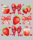 Une jolie collection vibrante de fraises, arcs en vichy rouges, icônes cardiaques, confiture de fraises et une boisson rafraîchissante aux fraises, le tout dressé contre un arrière - plan noir. Ce design respire des ambiances douces, douillettes et estivales, avec une touche de charme d'inspiration campagnarde.