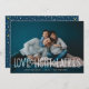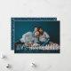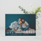 Un carte photo Hanoukka mignon et léger présente votre photo horizontale ou paysagère préférée avec "amour, lumière, loquets" recouvert de lettres blanches agrémentées d'étoiles de David. Personnalisez avec votre salutation Hanoukka, les noms et l'année en dessous. Les cartes sont retournées à un motif de neige et des étoiles sur bleu foncé.