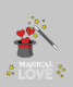 Une illustration d'une baguette magique qui fait des coeurs rouges est sortie d'un chapeau haut avec la citation "Amour magique". Vous rêvez d'être un magicien, un magicien ou un illusionniste ? Un sort d'amour à l'esprit ? Célébrez votre anniversaire, la Saint-Valentin et l'amour avec vos proches plus romantique et spécial.
