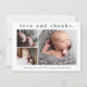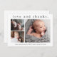 Un doux 3 photo collage faire-part de naissance et merci carte de note avec un type moderne simple et 3 photos sur le devant. Le dos est une carte postale avec un grand en-tête de nom complet et un message personnel de la famille. Cliquez sur le bouton Modifier pour customiser cette conception avec vos photos et détails.