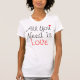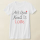 Coton blanc V - le cou T. "tout que vous avez besoin est amour" en rouge et le blanc sur l'avant. Le "amour est tout que vous avez besoin" dans le noir sur le dos. (Ce T-shirt regarde mieux lâchement ainsi je recommanderais d'obtenir un ou deux tailles)