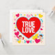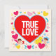 Ce design vibrant et coloré célèbre l'amour et la Saint-Valentin avec un grand cœur rouge au centre portant les mots "TRUE LOVE" en lettres blanches audacieuses. Autour du cœur central, une multitude de petits cœurs de différentes couleurs (jaune, rose, bleu, rouge) et des fleurs colorées ajoutent une touche festive et joyeuse. Deux petits anges, l'un à gauche tenant des cœurs rouges et l'autre à droite tenant un arc et une flèche, encadrent le cœur central, symbolisant l'amour et la romance. Le fond noir met en valeur les couleurs vives et les éléments graphiques, créant un contraste saisissant et attirant l'œil. Ce design est parfait pour exprimer des sentiments d'amour sincère et de passion, idéal pour des cartes de Saint-Valentin, des affiches ou des décorations romantiques.