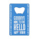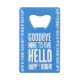 Célébrez la retraite d'un futur ex-collègue avec ce drôle d'ouvre-bouteille de style carte de crédit, qui affiche le sentiment, "Au revoir neuf à cinq Bonjour Happy Hour" dans une police blanche et grunge, avec un martini pomme intelligemment debout pour le "Y" dans "Happy" sur un arrière - plan bleu bébé apaisant. Reverse affiche un design identique. Design © W.H. Sim. Voir plus sur zazzle.com/wordsofwhimsy