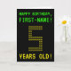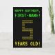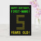 Le recto de cette carte d'anniversaire nerdy et personnalisée comprend les messages "HAPPY BANTHDAY" et "5 ANS !", ainsi qu'un nom de destinataire personnalisé. Les messages sur le devant ont un look inspiré des jeux rétro pixélisés. Le chiffre "5" sur le devant est composé de "5" chiffres de plus petite taille, donnant un look inspiré de l'art ASCII. L'intérieur comporte un message d'anniversaire qui peut être customisé. Un style geek, une carte de voeux d'anniversaire personnalisée comme celle-ci pourrait être une façon stupide d'envoyer un message de voeux d'anniversaire à quelqu'un célébrant son 5e anniversaire. [~Z0000366]