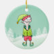 Lui-même de bande dessinée avec 3 dents, arborant un casquette vert avec veste assortie, shorts rouges, et cloches jingle sur ses chaussures. Dessin de Taylor Addams.