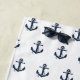 Simple mais frappante, cette serviette de plage dispose d'un arrière - plan à ancre bleu marine nautique avec un espace élégant pour ajouter votre nom ou un message de votre choix.