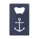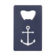 Inaugurateur minimaliste de la bouteille de carte de crédit marine avec ancre blanche sur arrière - plan bleu marine.