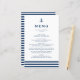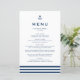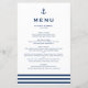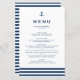Carte de menu moderne et classique parfaite pour les mariages nautiques et autres événements. Il présente une illustration d'ancrage bleu marine, une typographie classique et un motif rayé. Les textes sont entièrement modifiables. Personnalisez en ajoutant les noms, la date, l'heure et d'autres détails du menu.
