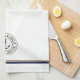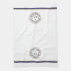 Serviette de cuisine personnalisée pour ancre nautique. Blanc avec bleu marine et brun brun emblème de cercle avec texte de bloc classique. Bleu marine double et brun brun brun bordé.
