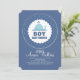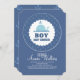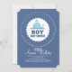Une charmante invitation au Baby shower Garçon dans un bleu moyen, avec de petites ancres blanches et une coquille à pétoncles avec une baleine noire. Conception par Freepik.com.