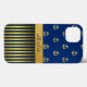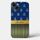 Stylish Samsung Note 4 coque fait, avec des graphiques d'ancrages de ton or contre un arrière - plan bleu, sur la moitié supérieure du coque. Le fond du coque a un motif à rayures dorées et bleues, avec une bande de tons dorés, au milieu. Personnalisez le texte bleu foncé, sur la bande d'or, pour vous-même ou comme une idée cadeau formidable.