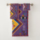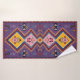 A vibrant, symmetrical fine art illustration inspired by traditional Andalusian weaving, featuring bold geometric diamonds in deep violet, saffron, and soft pink, accented with intricate tribal-style motifs and a classic red decorative border.