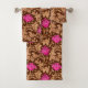 Ensemble de serviette dans un motif floral vintage de damassé de William Morris des fleurs et du feuille d'anémone, numériquement augmenté et coloré - feuille léger de brun de café, et fleurs aux nuances du fuchsia profond et du rose de corail sur un arrière - plan brun chocolat foncé