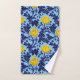 Ensemble de serviette dans un motif floral vintage de damassé de William Morris des fleurs et du feuille d'anémone, numériquement augmenté et coloré - le bleu de marine/indigo part, avec des fleurs dans les nuances du jaune de moutarde, sur un fond clair de bleu de ciel