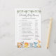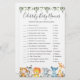 La carte de jeu "baby shower animal gestation" à thème animaux de la jungle avec une aquarelle safari animaux de la jungle avec illustration et aquarelle verte eucalyptus garland et élégante police manuscrite.