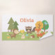 Le design est offert avec une variété d'animaux de la tourterelle boisée qui comprennent un cerf, un écureuil tenant à une noix de cacre, un lapin qui saute, un raton laveur, un hérisson, un renard et un oiseau sur l'arbre. Un arrière - plan de forêt printanière accueillant avec arbres, marguerites blanches, fleurs rouges et champignons pois. Personnalisez avec le nom de l'enfant.
