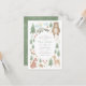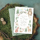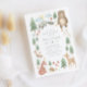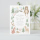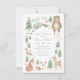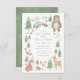 Invitation baby shower neutre genre avec scène forestière illustrée à la main avec arbres, fleurs, champignons, ours, lapin, raton laveur, écureuil, cerf, oiseau, renard et hérisson.
