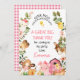 Carte de remerciements d'anniversaire coloré à la ferme ou à la ferme avec différents animaux de ferme, grange rose, citrouille et panier de pique-nique. Une excellente façon de remercier les invités d'être venus à la fête d'anniversaire de votre petite fille à la ferme.