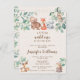 Aquarelle thème boisé mignon, animaux de la forêt avec motif de bois bébé douche invitation carte postale. Renard, ours, propre, hérisson, raton laveur et cerf avec feuilles et message : un peu sauvage est en route.