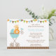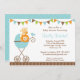 Adorable invitation baby shower avec un lion et une girafe assis dans une poussette à points bleus avec un bunting festif sur le dessus.