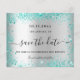 Une petite fille et tendance Enregistrer la carte Date pour une fête d'anniversaire de 18e (ou tout âge). Un arrière - plan faux argenté décoré de poussière de parties scintillant turquoise et verte. Personnalisez et ajoutez une date et un nom/âge. Le texte : Save the Date est écrit avec un grand script de style à la main tendance.
