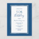 Sur le devant : Un arrière - plan bleu classique avec un cadre faux argent et blanc. Simple et élégant ! Modèles pour un nom et les détails de la fête. Le nom et le texte : 50ème anniversaire (ou n'importe quel âge) sont écrits avec un script de style écrit main, des lettres de couleur bleue. Parfait pour un anniversaire d'hiver, de printemps ou d'été nautique ! Retour : arrière - plan bleu classique. Conseil : Si vous ne voulez pas qu'il ressemble à une carte postale, cliquez sur customiser, allez à l'arrière et retirez le séparateur et le timbre postal.