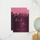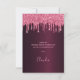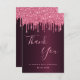 Un carte de remerciements pour un 50ème anniversaire (ou tout âge). Une couleur arrière - plan à l'aspect faux métallique bordeaux. Avec des gouttes de fausse parties scintillant rose, la peinture goutte à goutte. Sur le devant un script écrit à grande main et le texte : Merci, votre texte, titre et une date. Retour : Modèle pour Votre mot de remerciement et nom.