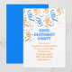 Invitation à la fête d'anniversaire Unisex avec confetti et la conception des serpentins. Couleurs bleues et orange avec deux polices différentes et modèle texte facile à utiliser. La carte est également disponible en téléchargement instantané. Au lieu des années dans le titre, vous pouvez utiliser "Surprise" pour une fête surprise.