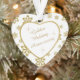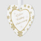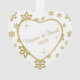 Il s'agit d'un ornement élégant pour célébrer le 50e anniversaire de Mariage d'un couple, soit au moment de la célébration, soit pour Noël. Il dispose d'un coeur blanc encadré de parties scintillant en faux or sur un flocon de neige parties scintillant or assorti sur arrière - plan blanc. À l'intérieur du coeur blanc est votre texte en or assorti, plus des images d'étoiles dorées scintillantes. Le texte est entièrement personnalisable, vous pouvez donc le faire dire comme vous voulez. Il y a un 2ème champ de texte à l'arrière, qui a la même bordure de flocon doré et l'image intérieure. Il s'agit d'un cadeau spécial de conservation de la famille qui sera chéri pour toujours. *Veuillez noter que l'image est imprimée et que l'ornement ne contient pas de parties scintillant.*