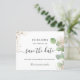 Une soirée branchée Save the Date pour un 40e anniversaire (ou tout autre âge). Un élégant arrière - plan blanc décoré de feuillage d'eucalyptus et de poussière de parties scintillant en faux or. Personnalisez et ajoutez une date, un nom et un texte. . Le texte : Save the Date est écrit avec un grand script de style à la main tendance avec des swashes.