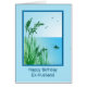 Une belle scène de pêche en mer. Une belle carte d'anniversaire pour un ex-mari qui aime la pêche, ou qui aime juste la mer. De grandes herbes encadrent une vue sur un océan calme avec un petit bateau et un homme qui pêche. Le verset intérieur a la chance du pêcheur de vouloir des "lignes serrées".