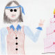 Carte de voeux paysager 5x7 - Hippie Anniversaire - Une hippie donnant un signe de paix debout à côté d'un grand gâteau de couche. J'aime l'incongruité d'un hippie (généralement un humble minimaliste) debout à côté de ce gâteau rose géant et audacieux. Le gâteau est odieusement gros et surestimé. Au moins il y en aura assez pour partager avec sa commune ! Le dessin original est un crayon coloré sur papier, scanné et placé sur la carte.