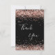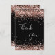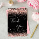 Un carte de remerciements d'anniversaire féminin et élégant. Une couleur noire arrière - plan. Avec des confettis en or rose. Sur l'avant grand main écriture et le texte : Merci. Retour : Personnalisez et ajoutez Votre note de remerciement et votre nom. Le nom est écrit avec un script de style moderne écrit à la main.